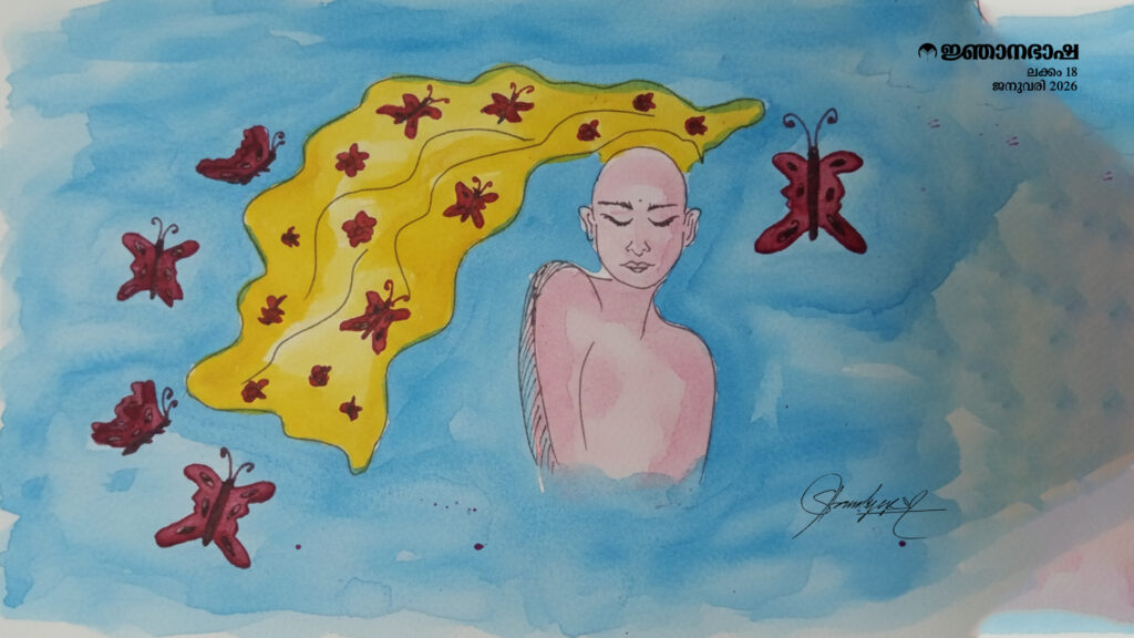 നിറയെ പൂമ്പാറ്റകൾ തുന്നിപിടിപ്പിച്ച ആ ഷാൾ അവളുടെ മുടിയില്ലാത്ത തലയിൽ നിന്ന് ഇടയ്ക്കിടയ്ക്ക് വഴുതി താഴെ വീണുകൊണ്ടിരുന്നു.